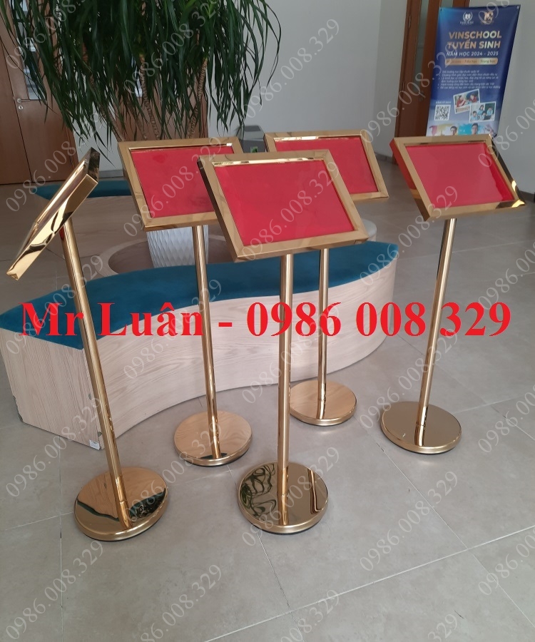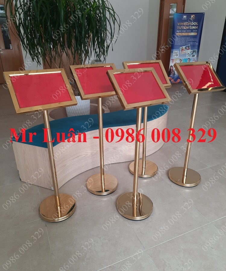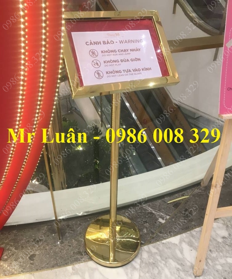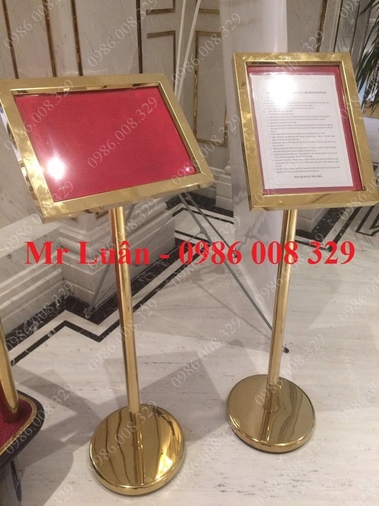 Cấu tạo: Khung bảng có mặt mica trong suốt bảo vệ giấy nội dung, trụ đứng inox chắc chắn và đế đúc nặng chống lật.