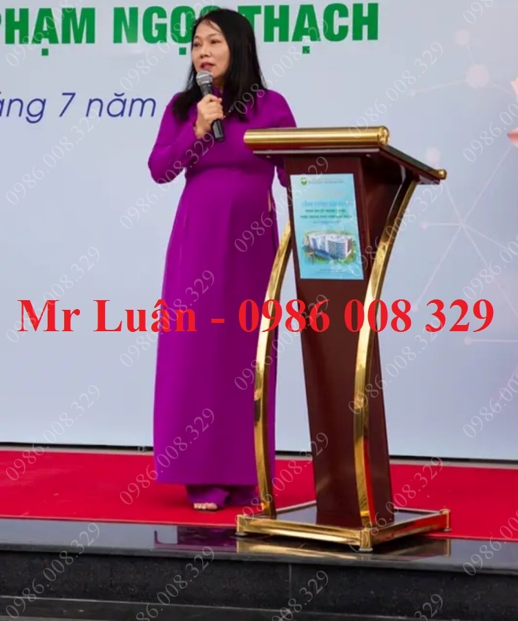 Trong các buổi lễ quan trọng, bục phát biểu không chỉ là nơi đứng thuyết trình mà còn là linh hồn của sân khấu, thể hiện tầm vóc của đơn vị tổ chức. Bục phát biểu khung inox vàng màu gỗ đỏ với sự phối hợp màu sắc kinh điển giữa sắc đỏ truyền thống và vàng kim hiện đại, mang lại vẻ đẹp quyền lực, thịnh vượng và vô cùng nổi bật dưới ánh đèn sự kiện.