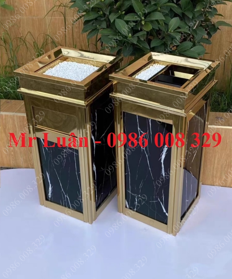 Ốp đá hoa cương tự nhiên: Bốn mặt thùng rác được ốp đá vân sắc nét, chịu được tác động ngoại lực và cực kỳ dễ lau chùi.