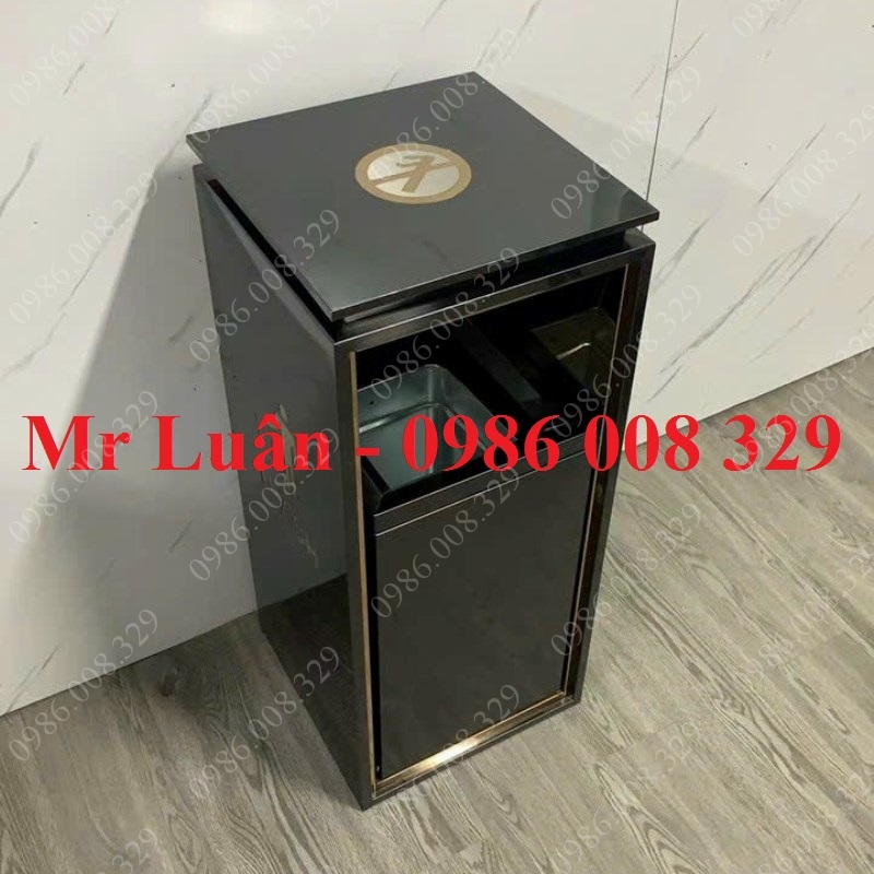 Thùng rác inox đen để sảnh có logo cấm hút thuốc