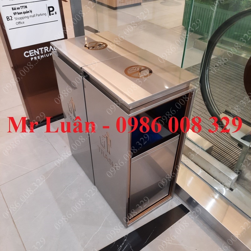 Cấu tạo: Thân vuông đứng, cửa bỏ rác bên hông, mặt trên phẳng in biển báo cấm hút thuốc.