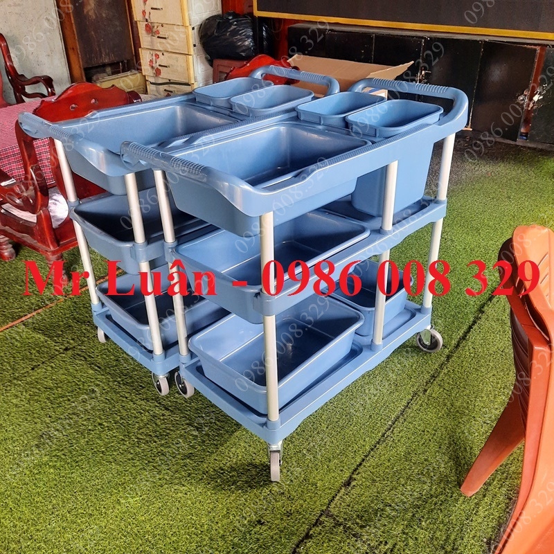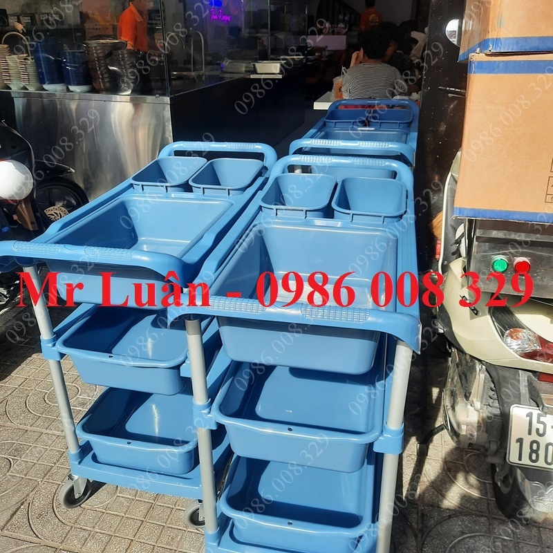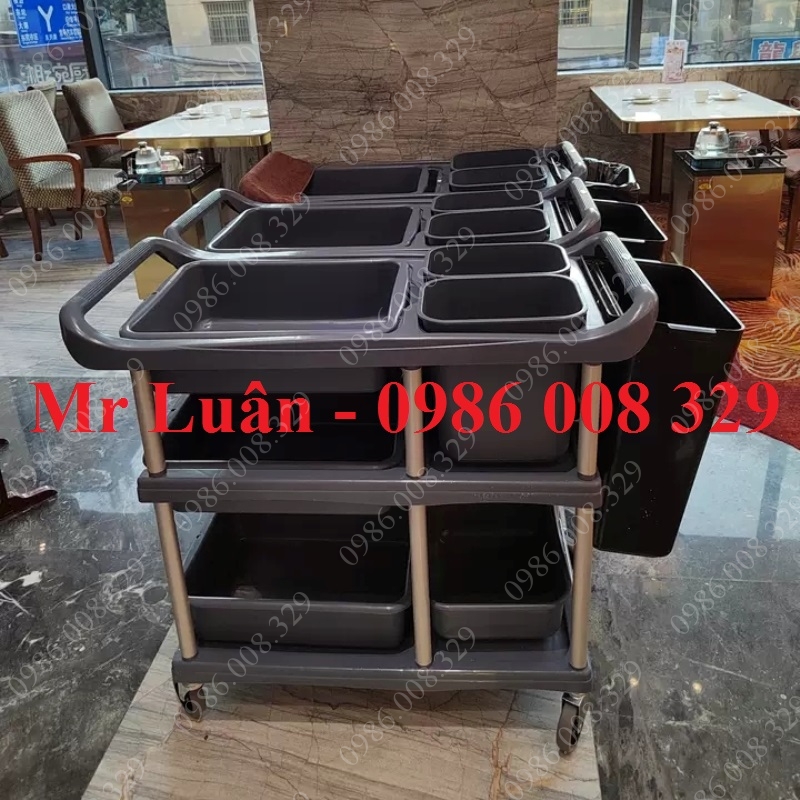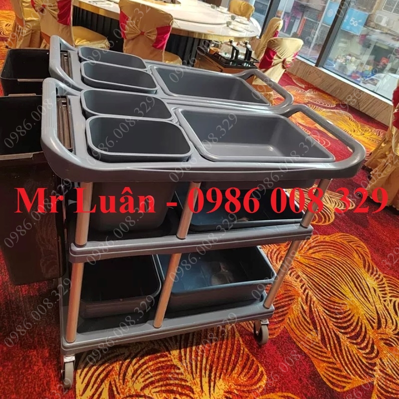 - Xe dọn thức ăn có nhiều tầng đựng khay nhựa và xô nhựa giúp nhân viên phục vụ phân loại thức ăn thừa và các loại vật dụng như chén dĩa dễ dàng, giúp cho công việc dọn dẹp bàn ăn diễn ra nhanh chóng.