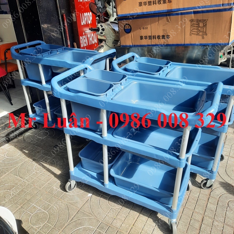- Xe đẩy phục vụ được thiết kế 3 tầng linh hoạt để được các thau nhựa và xô nhựa dùng để đựng thức ăn thừa , tô chén đĩa. Thau nhựa và xô nhựa được làm bằng nhựa PP cao cấp hạn chế bám bẩn, dễ dàng vệ sinh.