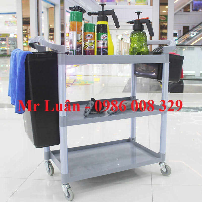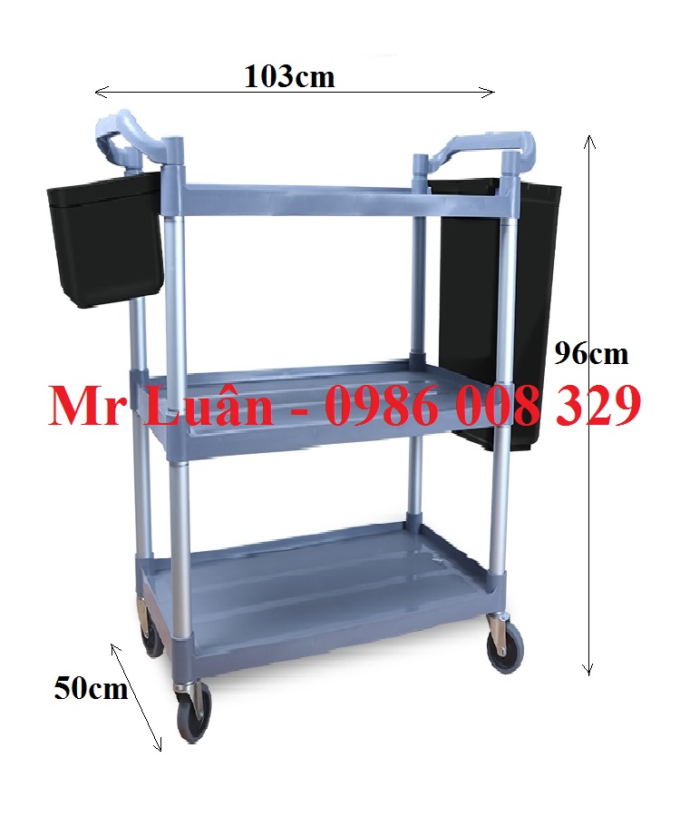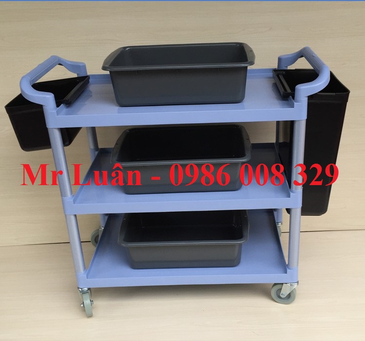 - Xe đẩy phục vụ được thiết kế 3 tầng linh hoạt để được các thau nhựa và xô nhựa dùng để đựng thức ăn thừa , tô chén đĩa. Thau nhựa và xô nhựa được làm bằng nhựa PP cao cấp hạn chế bám bẩn, dễ dàng vệ sinh.