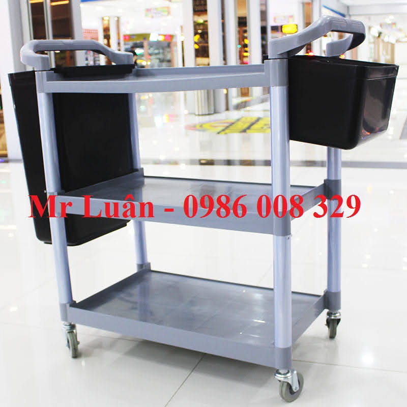Xe đẩy dọn bàn nhựa xám size lớn có 2 thùng gắn