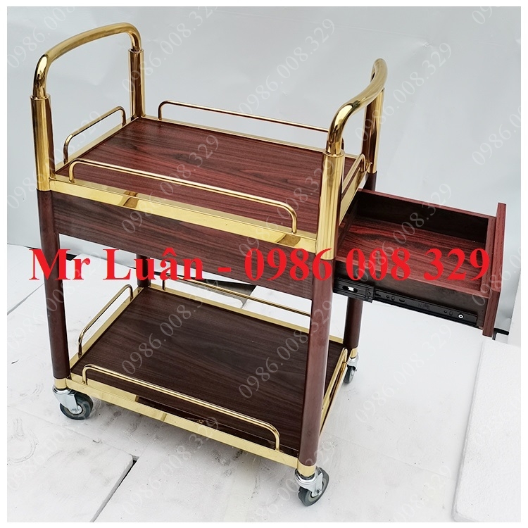 Trong nghệ thuật phục vụ tại các nhà hàng 5 sao, resort cao cấp hay các phòng VIP riêng biệt, một chiếc xe đẩy rượu không đơn thuần là phương tiện vận chuyển mà còn là món đồ nội thất nâng tầm đẳng cấp không gian. Xe đẩy rượu nhà hàng 2 tầng inox vàng mặt gỗ có ngăn kéo mang đến một vẻ đẹp quý phái, là điểm nhấn rực rỡ dưới ánh đèn sảnh tiệc.