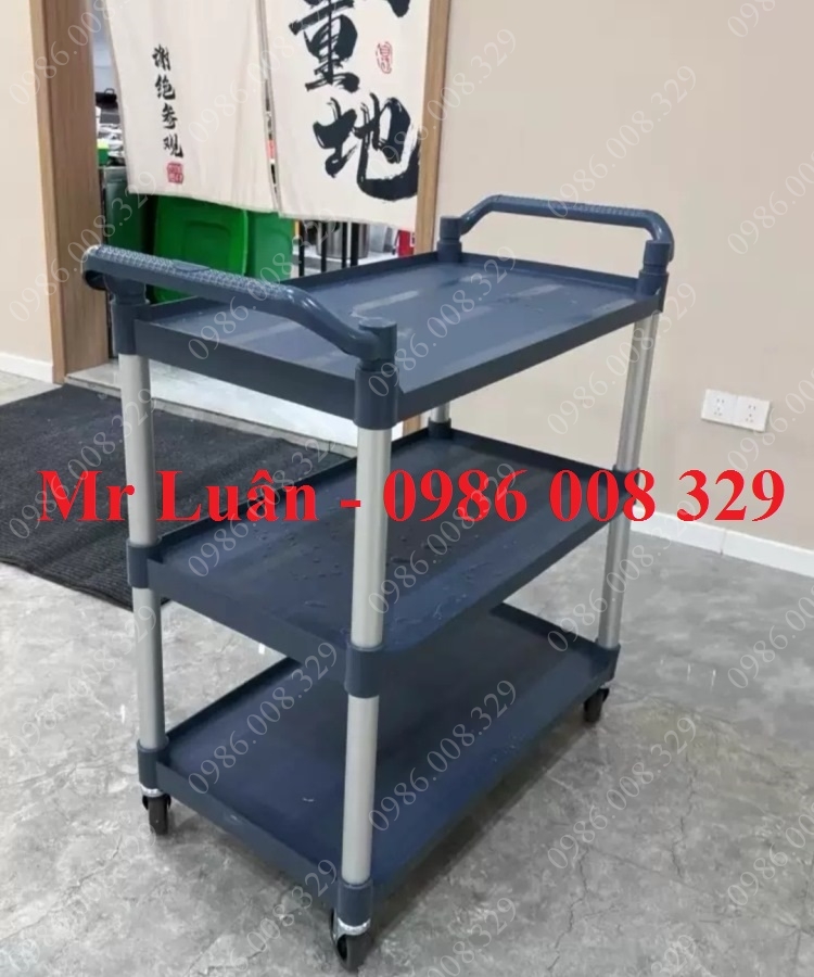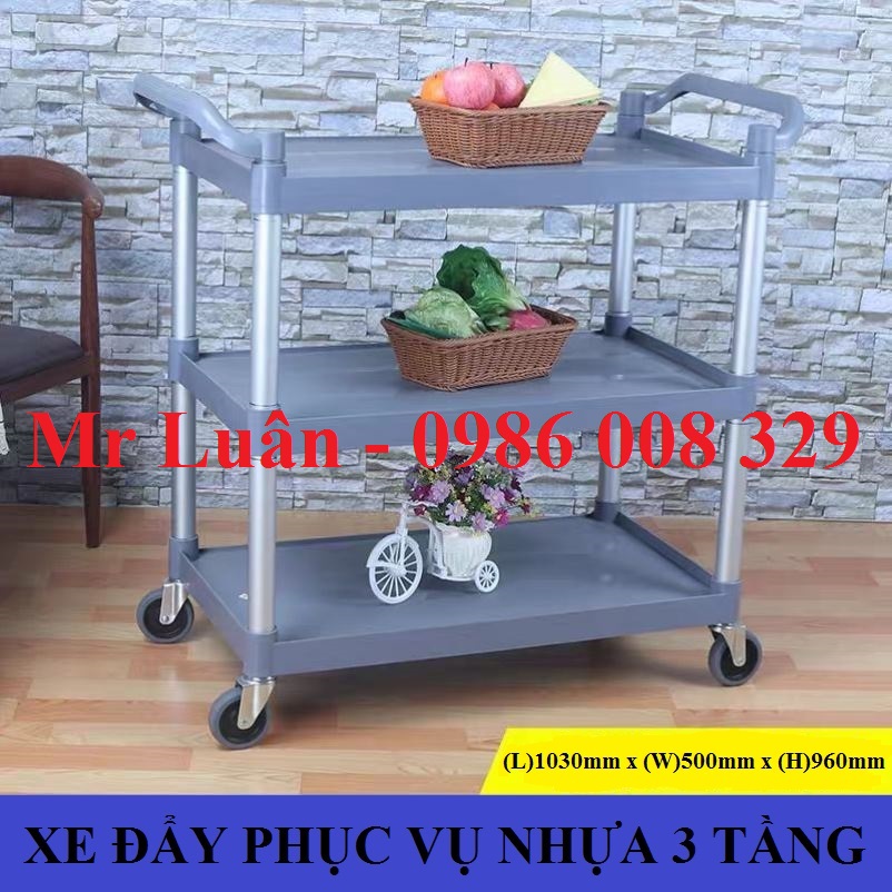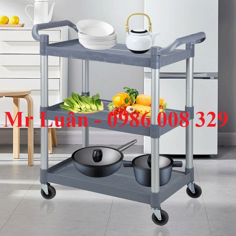 Xe đẩy thức ăn nhựa xám 3 tầng thanh tròn size lớn