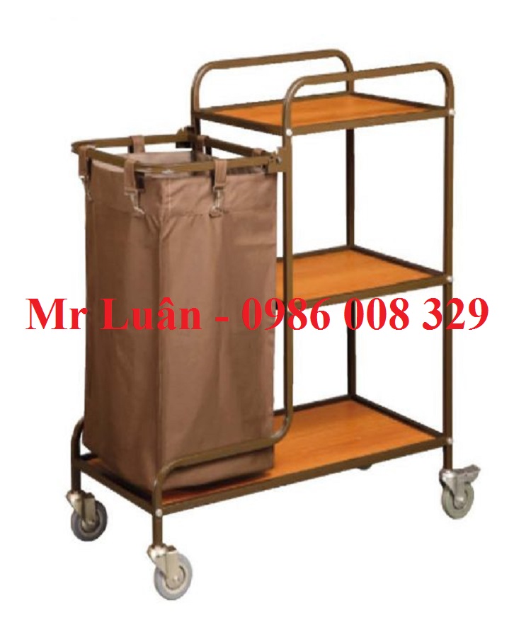 Màu gỗ trầm ấm khi kết hợp với khung thép sơn nâu tạo nên vẻ ngoài thanh lịch, giúp xe không chỉ là công cụ dọn dẹp mà còn như một món đồ nội thất di động. Thiết kế này giúp giảm thiểu tiếng ồn khi nhân viên đặt đồ dùng kim loại hoặc sành sứ lên xe, duy trì không gian yên tĩnh tuyệt đối cho hành lang khách sạn.