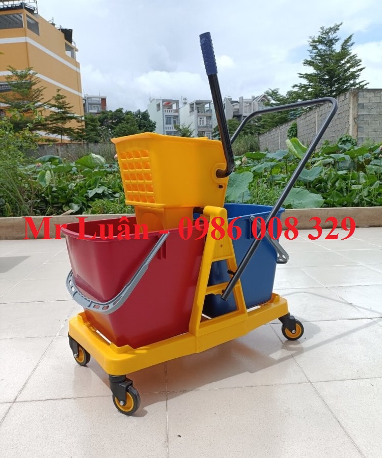 Ngăn nước sạch & Ngăn nước thải: Xe gồm 2 thùng nhựa (thường là màu xanh và đỏ) dung tích tổng lên đến 60 lít. Một bên chứa dung dịch nước lau sàn sạch, bên còn lại hứng nước bẩn sau khi vắt.